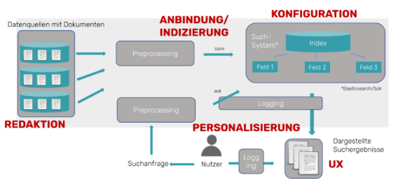 Das Suchsystem selbst kann außerdem individuell konfiguriert werden. Es bietet Anpassungsmöglichkeiten an verschiedene Anforderungen (welche wir weiter unten im Rahmen der Nutzerperspektive genauer erklären). Im Wesentlichen lässt sich durch die Konfigurationsoptionen eines Suchsystems aber erreichen, dass eine Suche auch dann relevante Ergebnisse liefert, wenn die Suchanfrage nicht zu 100 Prozent mit einem Begriff im durchsuchten Dokument übereinstimmt.