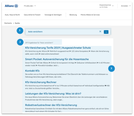Mithilfe geeigneter Suchmethoden können Nutzer*innen gezielt zu ihrem Ziel geleitet werden. Zu diesen Methoden gehören eine automatische Vervollständigungsfunktion beim Tippen (Autosuggest), ebenso wie dynamische Filter und Facetten, die bei einer sinnvollen Eingrenzung der Suchergebnismenge unterstützen.
