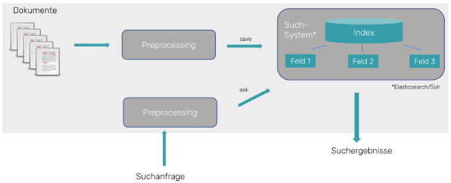 Voraussetzung ist eine Sammlung an Dokumenten, welche durchsucht werden sollen. Die Inhalte dieser Dokumente werden im Suchsystem hinterlegt. In der Regel erfordert das eine Form der Vorverarbeitung – was konkret dabei passiert, ist an dieser Stelle nicht relevant.