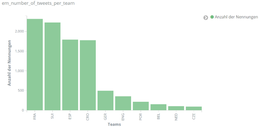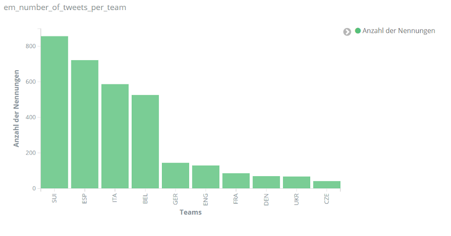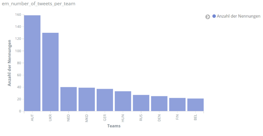 Unabhängig von einzelnen Spielern wurde aber auch den einzelnen Mannschaften der EM verschieden viel Interesse entgegengebracht. Wie zu erwarten bei unserer Analyse, die deutschsprachige Reaktionen in den Vordergrund stellt, erscheint das deutsche Team besonders häufig in den Kommentaren auf Social Media. Mit England und Italien folgen anschließend die beiden Finalisten.