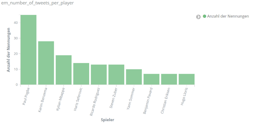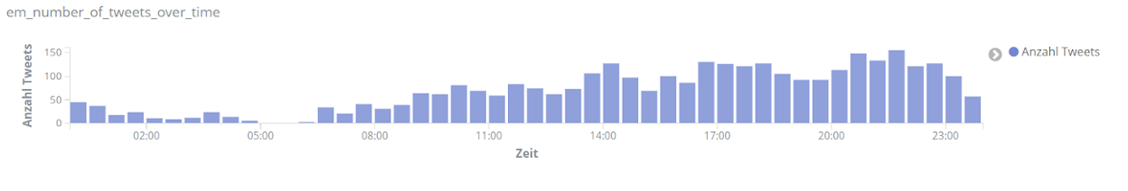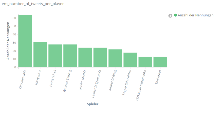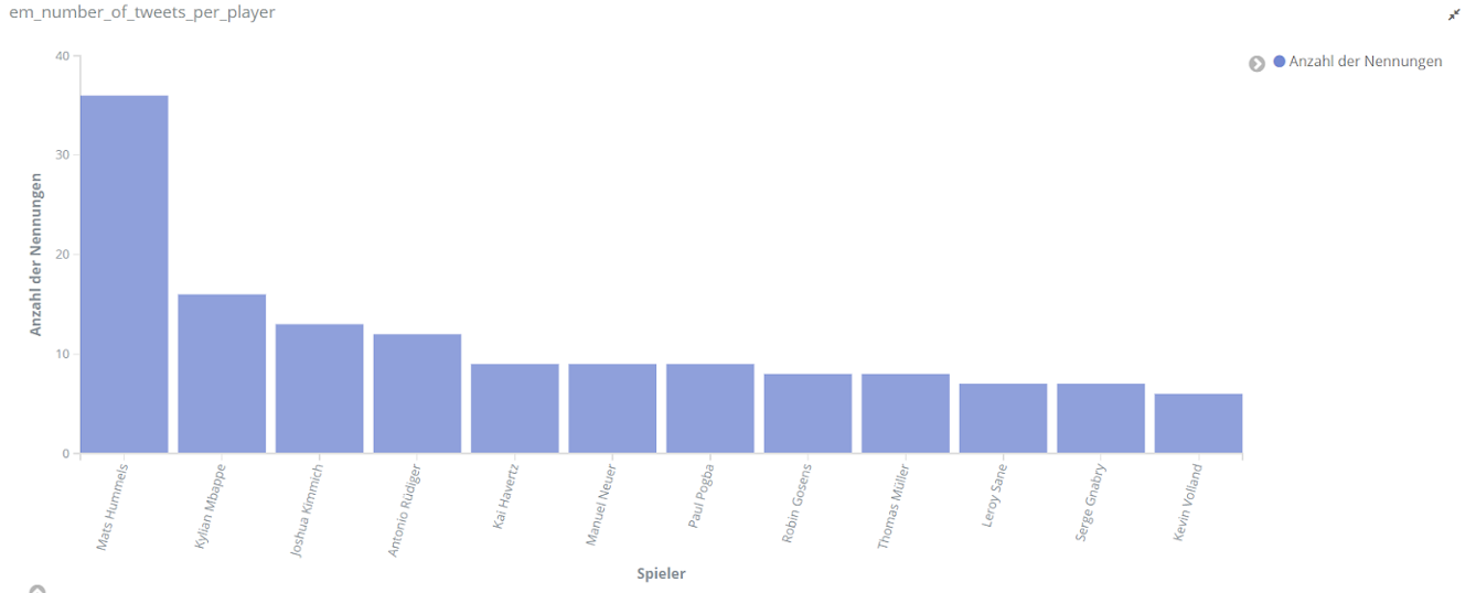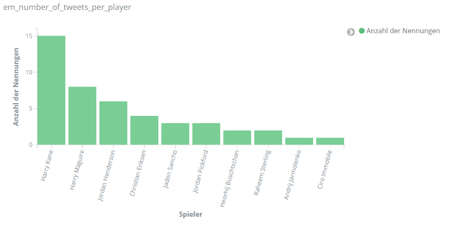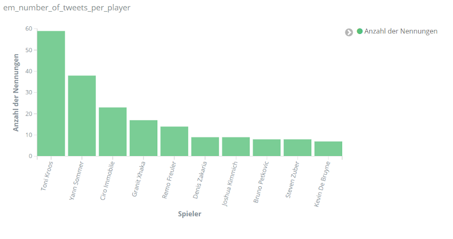 Für echte Aufregung sorgt aber das Spiel Dänemark gegen Finnland am 12. Juni. Dänemarks Spieler Christian Eriksen kollabiert auf dem Spielfeld. Über Stunden dominiert er dementsprechend das Geschehen auf Social Media. Tweets über Eriksen sind um ein vielfaches häufiger als bezüglich anderer Spieler. Unser Text-Mining-Framework findet unter den häufigsten Entitäten für den Zeitraum 18 bis 22.30 Uhr am 12. Juni Begriffe wie “Herz-Lungen-Wiederbelebung”, “Bewusstsein”, “Krankenhaus”, aber auch “Gott” und “Daumen”, die dem Spieler wohl gedrückt wurden.