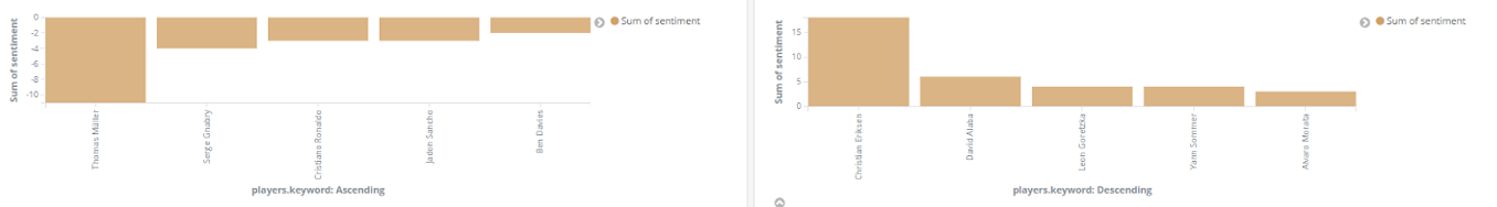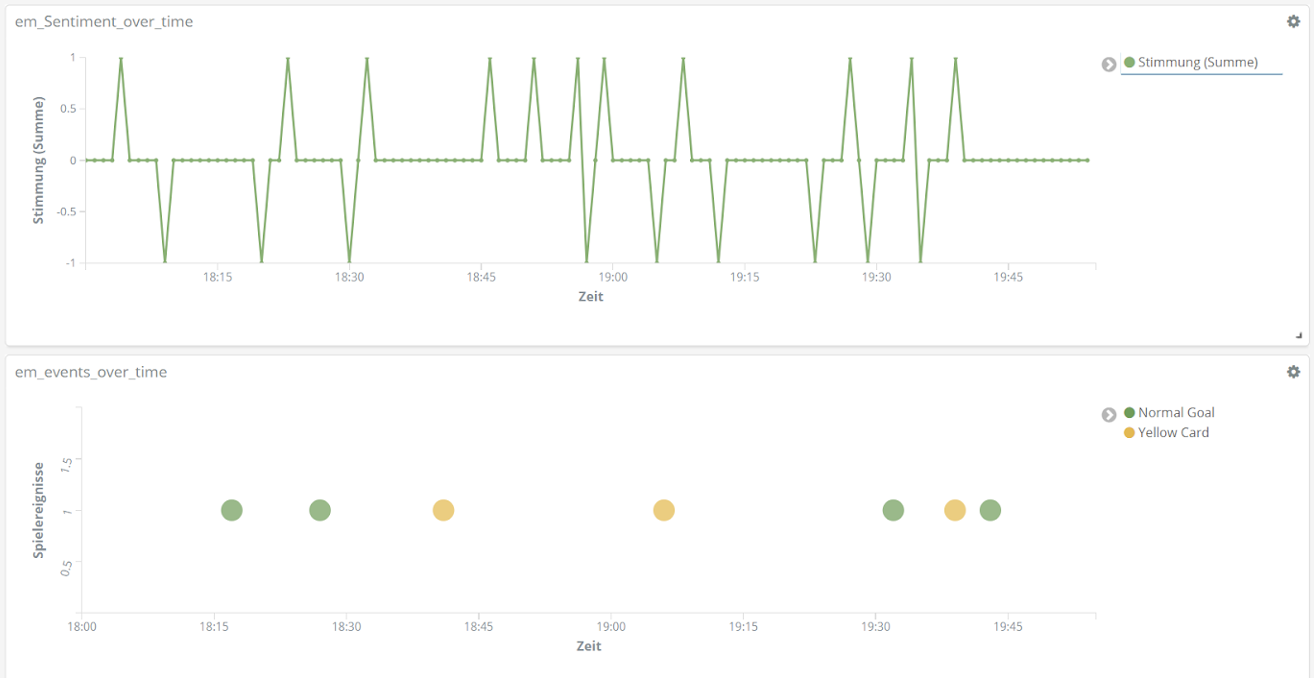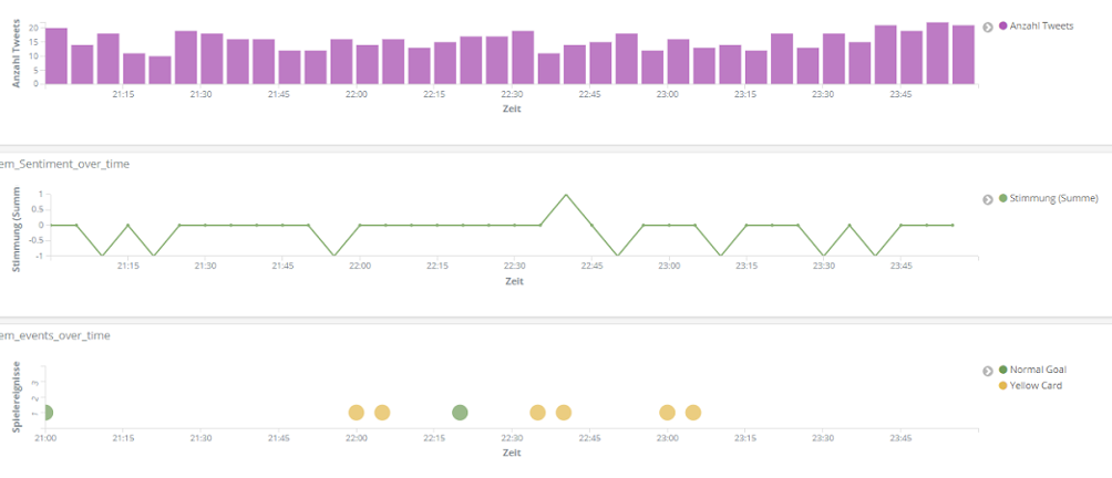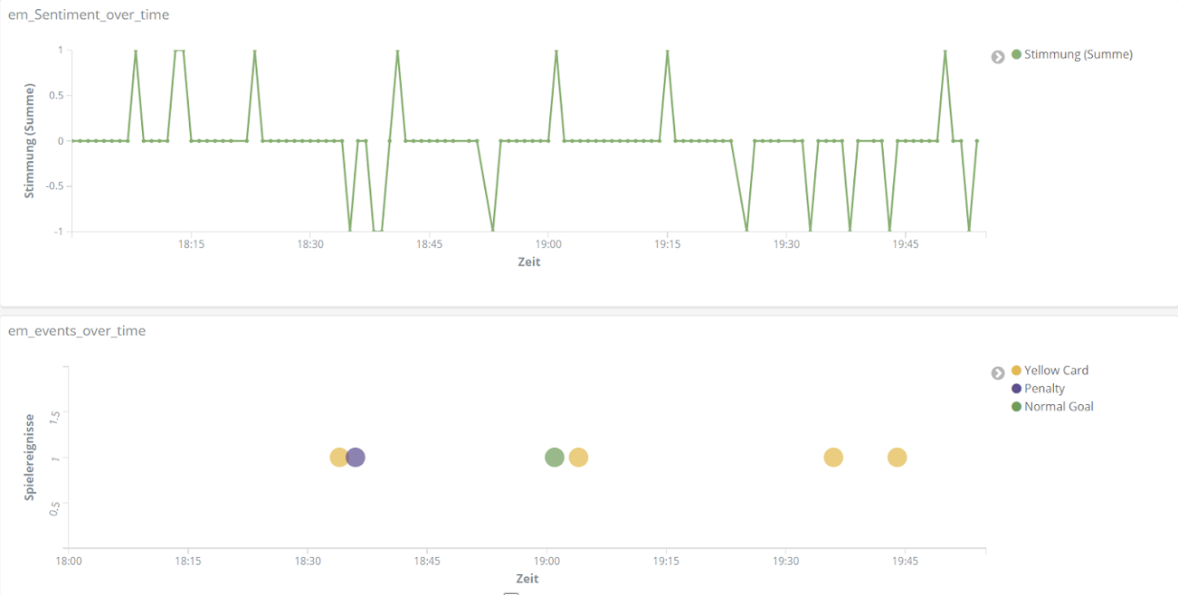 All das analysieren wir mithilfe der Entitäten-Erkennung und der Sentiment-Analyse aus unserem Text Mining Framework TXTWerk sowie dem Open Source Suchsystem Elasticsearch und der dazugehörigen Visualisierungsplattform Kibana. Damit vereinen wir unsere beiden Kernkompetenzen, Suche und Text Mining, zu einem geeigneten Analyse-Tool auch für das Thema Fußball.