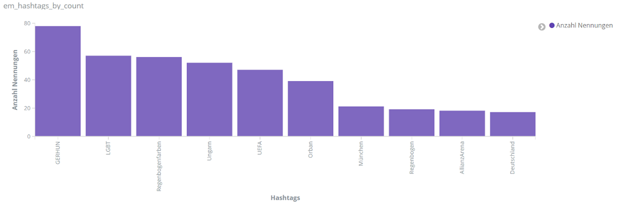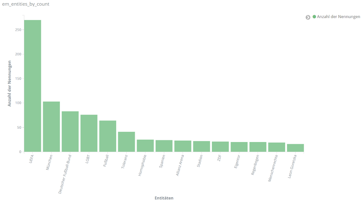 Aber auch die politischen Debatten, die thematisch mit der EM einhergingen, spiegeln sich wider, beispielsweise in Entitäten wie “Pandemie”, “Rassismus”, “LGBT”, “Homophobie”, “Menschenrechte” und “Toleranz”.