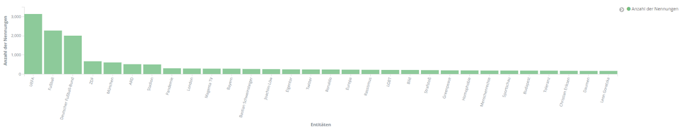 Abschließend betrachten wir, welche Themen die EM 2020 besonders geprägt haben. Unter den Entitäten, die von TXTWerk am häufigsten in den Kommentaren zur EM gefunden wurden, befinden sich mehrere grundsätzliche Themen: