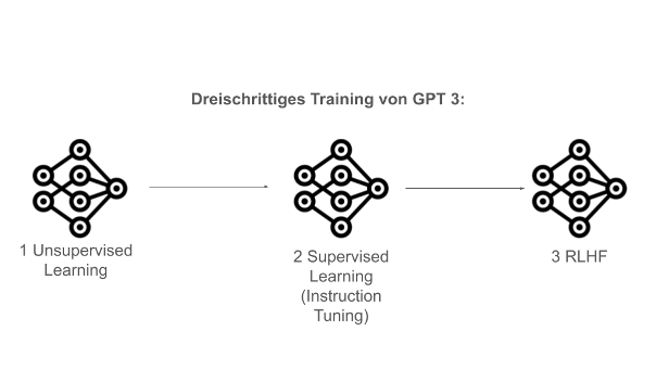 - In einem zweiten Schritt lernte das Modell in einem überwachten Lernen, Instruktionen zu folgen. Dazu haben Menschen verschiedene Prompts ausgewählt und idealtypische Antworten geschrieben, auf denen das Modell trainiert wurde.