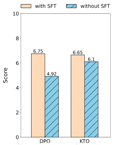 Die Grafikt rechts zeigt die Ergebnisse von Saeidi et. al. Sie verglichen DPO und KTO jeweils mit Instruction Tuning, also Supervised Fine Tuning (SFT), und ohne. Als Modell wählten sie Mistral-7B-v0.1. Die Evaluation fand auf dem MT-Benchmark statt. Während DPO mit 6,75 leicht bessere Ergebnisse als KTO mit 6,65 erzielt, schafft KTO auch ohne SFT ein gutes Ergebnis mit 6,1.