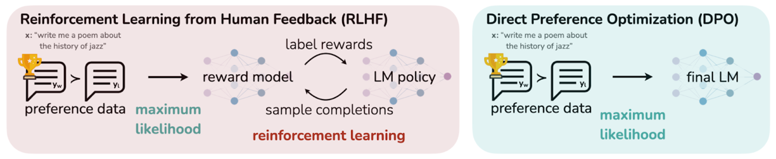 DPO ist eine ressourcensparsame Alternative zu RLHF, welches einen der größten Nachteile von RLHF beseitigt: Für RLHF müssen drei Modelle im teuren VRAM gehalten werden: das Ausgangsmodell, das Belohnungsmodell und das zu optimierende Modell. DPO führt Gradientenabstieg direkt auf dem zu optimierenden Modell durch. Es kommt also ohne Belohnungsmodell und Reinforcement Learning aus.