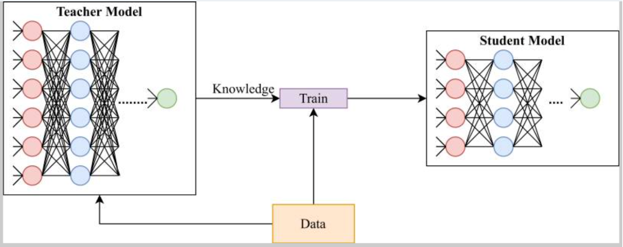 Das kleinere Modell wird als Schülermodell und das große Modell als Lehrermodell bezeichnet. Wie in der unteren Grafik dargestellt, versucht das Schülermodell, das Wissen aus dem Lehrermodell zu destillieren, indem es das Verhalten des Lehrers nachahmt. Mit anderen Worten: Die Verlustfunktion des Schülermodells wird danach berechnet, wie gut der Schüler die Ausgabe des Lehrers nachahmt oder anders ausgedrückt, wie gut das Schülermodell tatsächlich das wahre Label der Trainingsdaten vorhersagt.