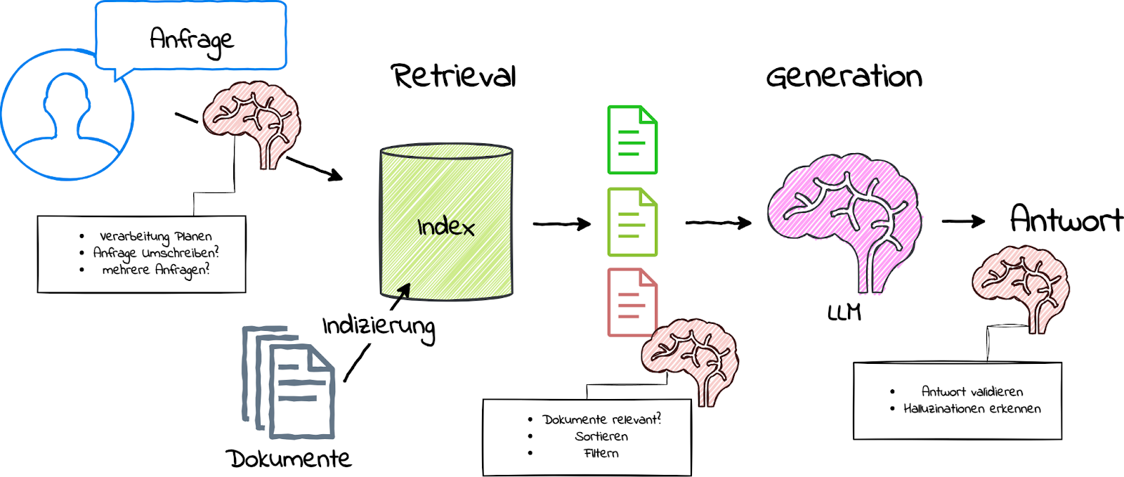 Wie in der Grafik visualisiert, kann ein selbstreflektives RAG-System mehrere zusätzliche Schritte umfassen. Ein Modul kann anhand einer Nutzeranfrage planen, welche Verarbeitungsschritte notwendig sind, oder ob die Anfrage für den Suchindex umgeschrieben werden muss. Ein weiteres Modul kann die gefundenen Kontextdokumente nach ihrer Relevanz sortieren und filtern. Noch ein weiteres Modul kann die Antworten validieren und Halluzinationen erkennen. Für diese zusätzlichen Schritte können kleinere LLMs oder speziell trainierte Sprachmodelle eingesetzt werden.