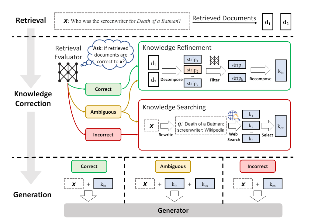 Eine neue Methode von SELF-RAG ist "Corrective RAG", welches in dem Paper "Corrective Retrieval Augmented Generation" vorgestellt wird. Der Kern dieser Methode besteht darin, dass die gefundenen Dokumente von einem LLM bewertet werden und anhand dieser Bewertung Folgeschritte abgeleitet werden, wie zum Beispiel eine zusätzliche Websuche.