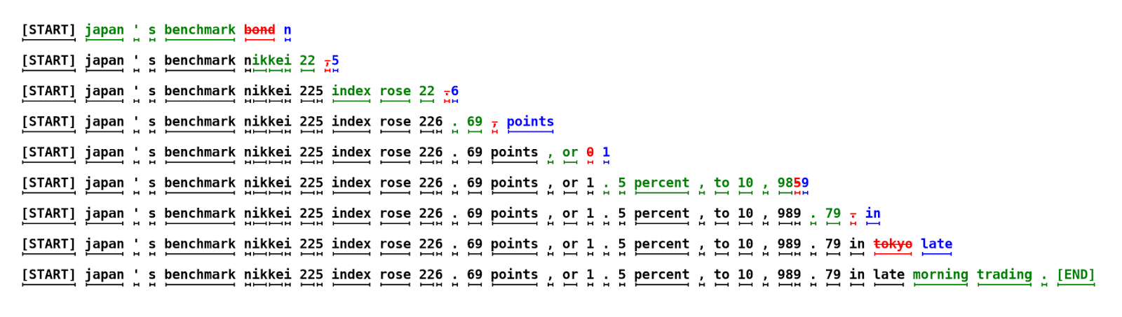 Jede Zeile repräsentiert eine Iteration des Algorithmus. Die grünen Tokens sind die Vorschläge des kleinen Modells, die vom Zielmodell akzeptiert wurden. Die roten und blauen Tokens sind die abgelehnten Vorschläge und deren Korrekturen. Zum Beispiel wurde in der ersten Zeile das Zielmodell nur einmal ausgeführt und es wurden 5 Tokens generiert.