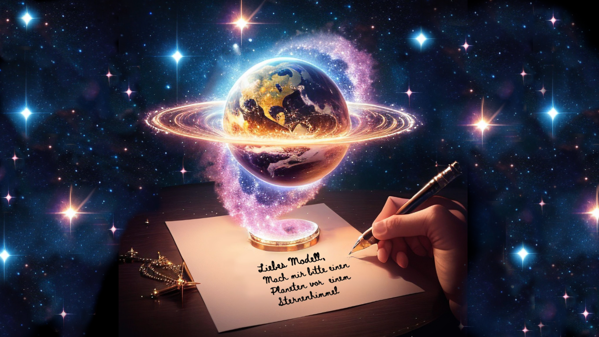 Header: Generiert mit SDXL DreamShaper, Prompt: „A wonderful planet in a glittering galaxy magically appearing from handwriting on a piece of paper, deviantart hd, artstation hd, ultrarealistic, highly detailed award winning artwork“ – Text nachträglich eingefügt