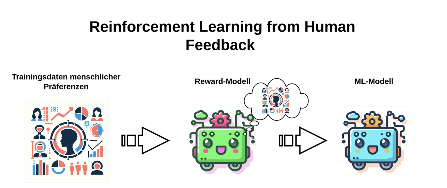Um ein Modell trotzdem so trainieren zu können, dass es tendenziell akzeptable Antworten erzeugt, kommt Reinforcement Learning ins Spiel. Bei RLHF bewerten menschliche Experten, welche Antworten eines Dialogsystems bevorzugt werden sollten. Anders als beim herkömmlichen „Supervised Learning“, wo das Machine-Learning-Modell direkt aus den Trainingsdaten lernt, geht RLHF einen Schritt weiter: Es versucht, die Vorlieben der Experten nachzubilden. Dafür wird ein separates Modell geschult – das sogenannte „Reward Model“. Seine Hauptaufgabe ist es, menschliche Präferenzen zu antizipieren. Das Haupt-Sprachmodell wird anschließend mithilfe dieses Reward Modells trainiert. Obwohl es unmöglich ist, menschliche Vorlieben perfekt vorherzusagen, erlaubt dieser Ansatz die Nutzung einer wesentlich größeren Menge an Trainingsdaten. Vermeintlich gute Antworten werden belohnt, schlechte Antworten bestraft, wodurch das Modell schrittweise den menschlichen Präferenzen angenähert wird.