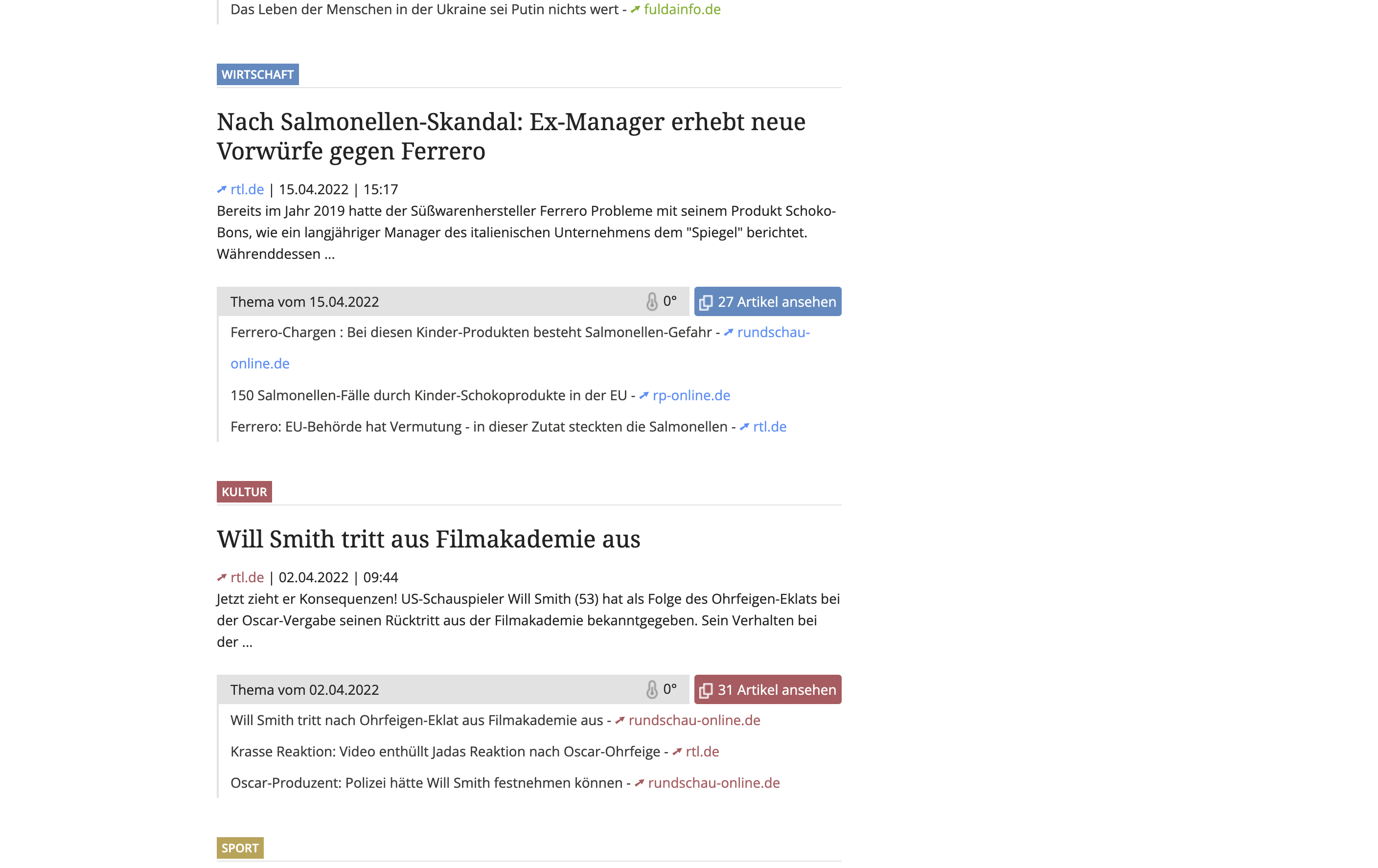 Für nachrichten.de setzen wir unsere eigens entwickelte Crawler-Technologie ein, Verschlagworten und Clustern aus verschiedenen Medienquelle die relevantesten Nachrichten nach Themenbereichen.