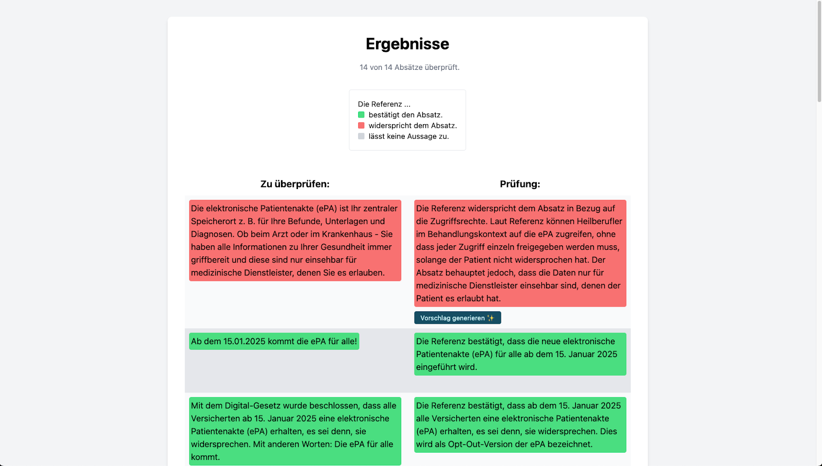 Der Prozess beginnt mit der Definition eines Prüfauftrags, bei dem die zu prüfende Webseite und die relevanten Datenquellen verknüpft werden. Hierfür kommt ein Webcrawler zum Einsatz. Die KI prüft nun Absatz für Absatz, ob die Quelle dem Ausgangstext an irgendeiner Stelle widerspricht. Gibt es einen Widerspruch, wird dieser dem Anwender angezeigt. So erhält der Nutzer Absatz für Absatz Hinweise, wo er den Ausgangstext anpassen muss.